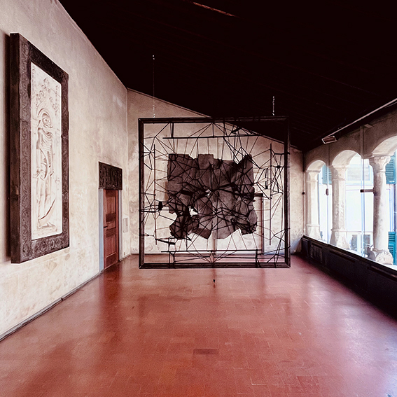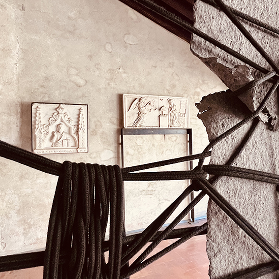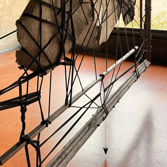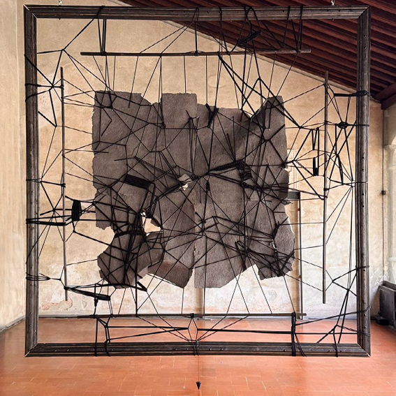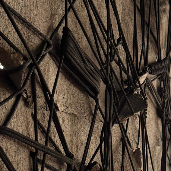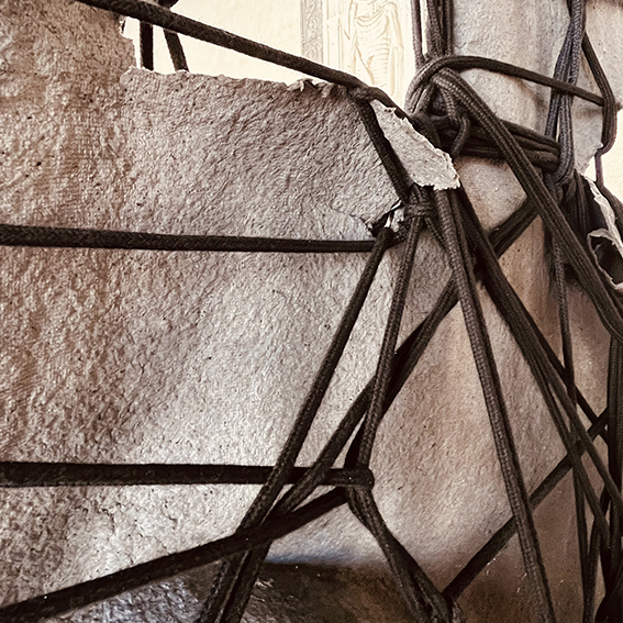 Handmade paper, ash, wood, rope, plumb line