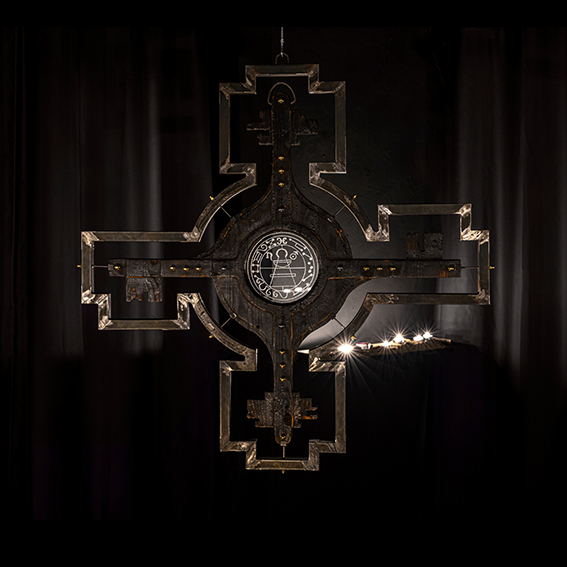 Burnt wood, iron, fire, glass